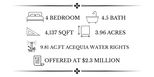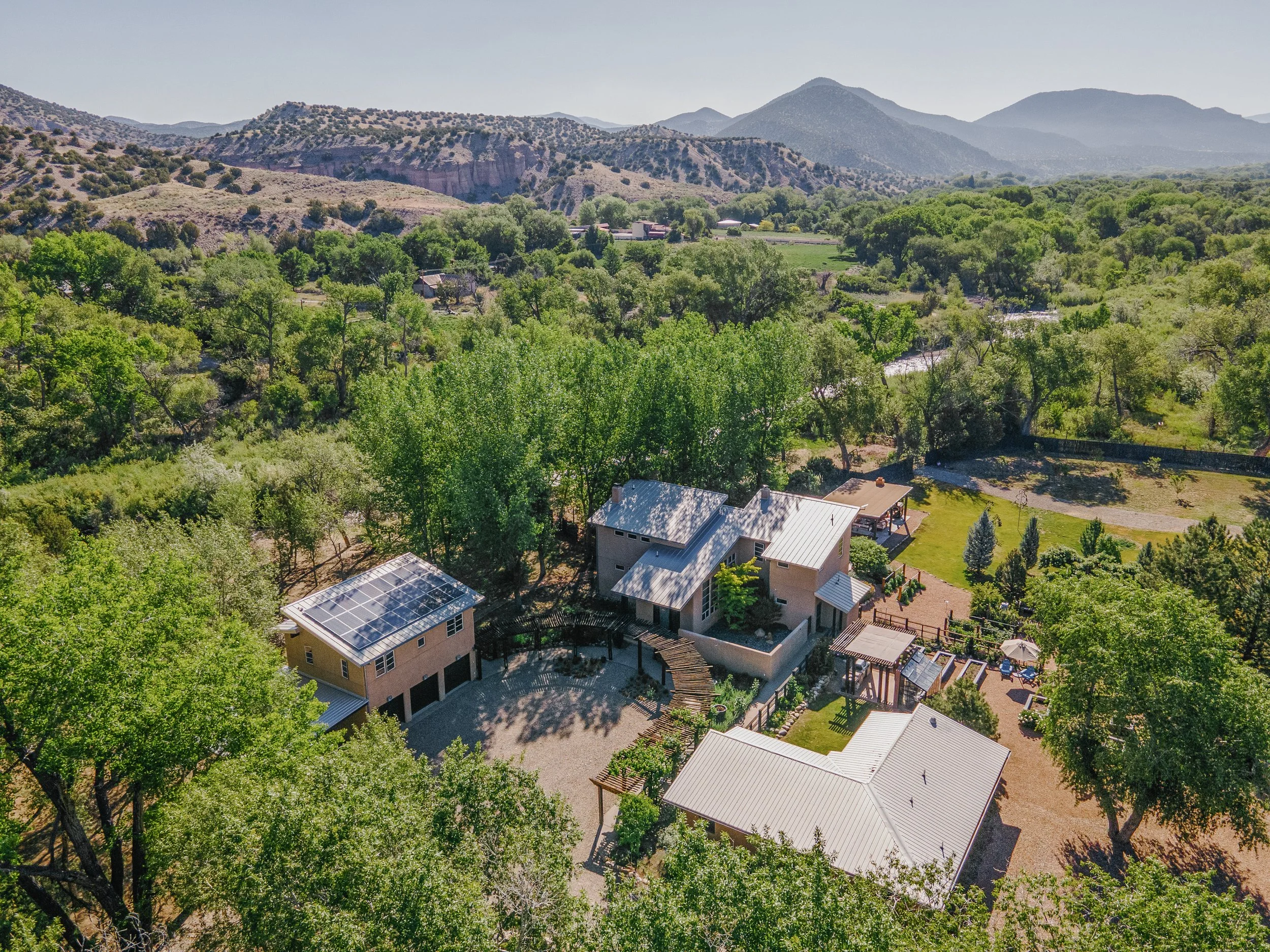 Nestled along the Rio Embudo in the heart of Dixon, New Mexico is a 3.96-acre dreamscape. Nature’s playground meets sophisticated retreat. Generous interior and exterior spaces intertwine inspiring creative and horticultural pursuits, entertaining and hosting guests, as well as offering opportunities for multi-generational living and gathering. Over 4,000 square feet of interior living space is thoughtfully dispersed across an impressive main adobe home, a cozy 2nd story casita and a sprawling garden house complete with guest space. Additional structures include a greenhouse and outdoor kitchen, entertaining pavilion with fireplace, climate controlled art studio, heated 3 car garage, two storage sheds, and a pole barn.